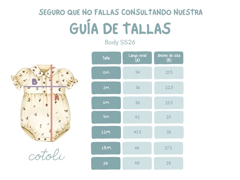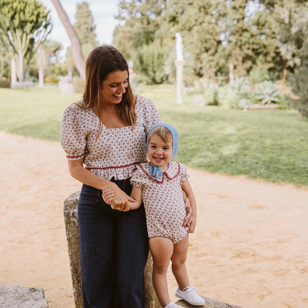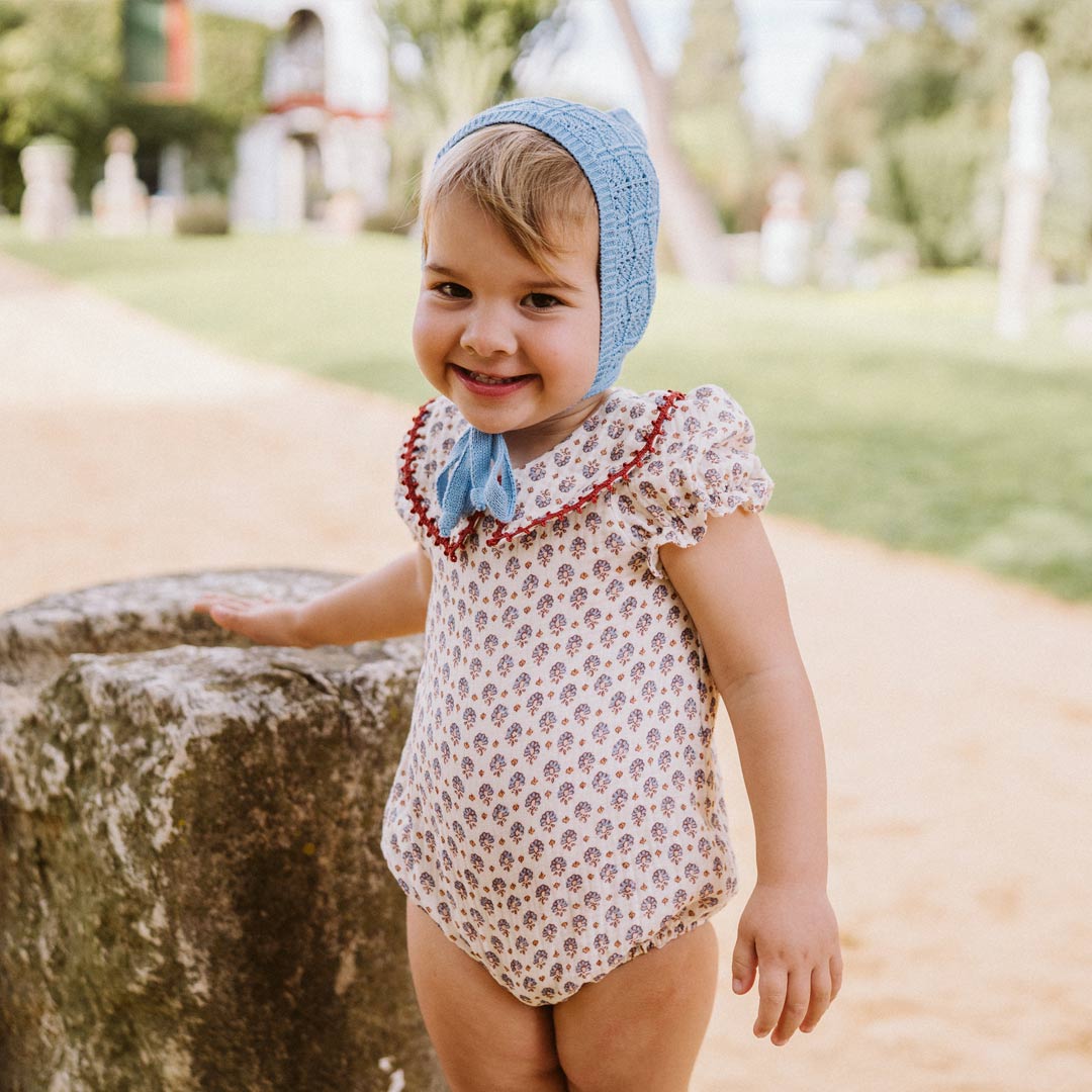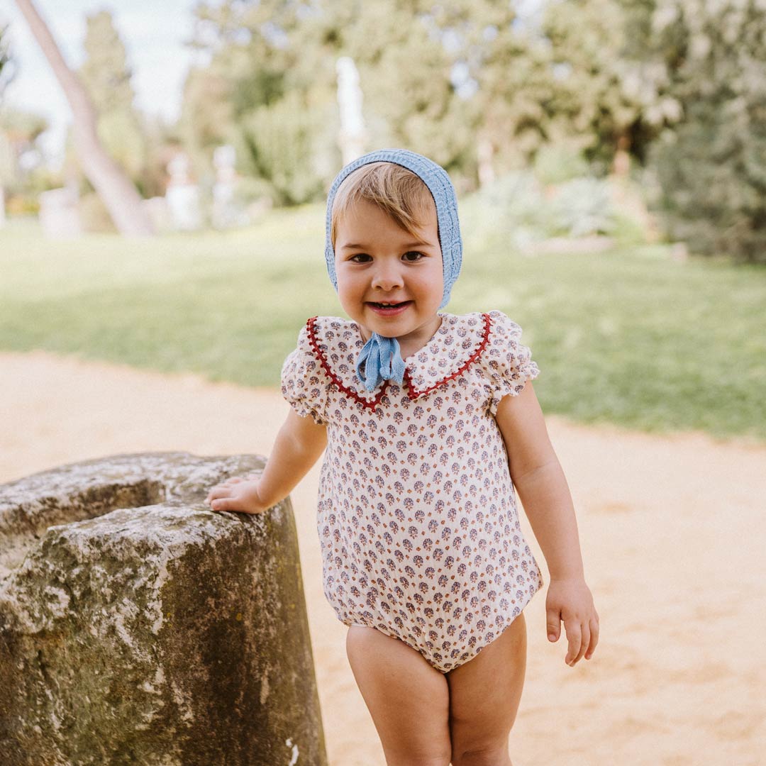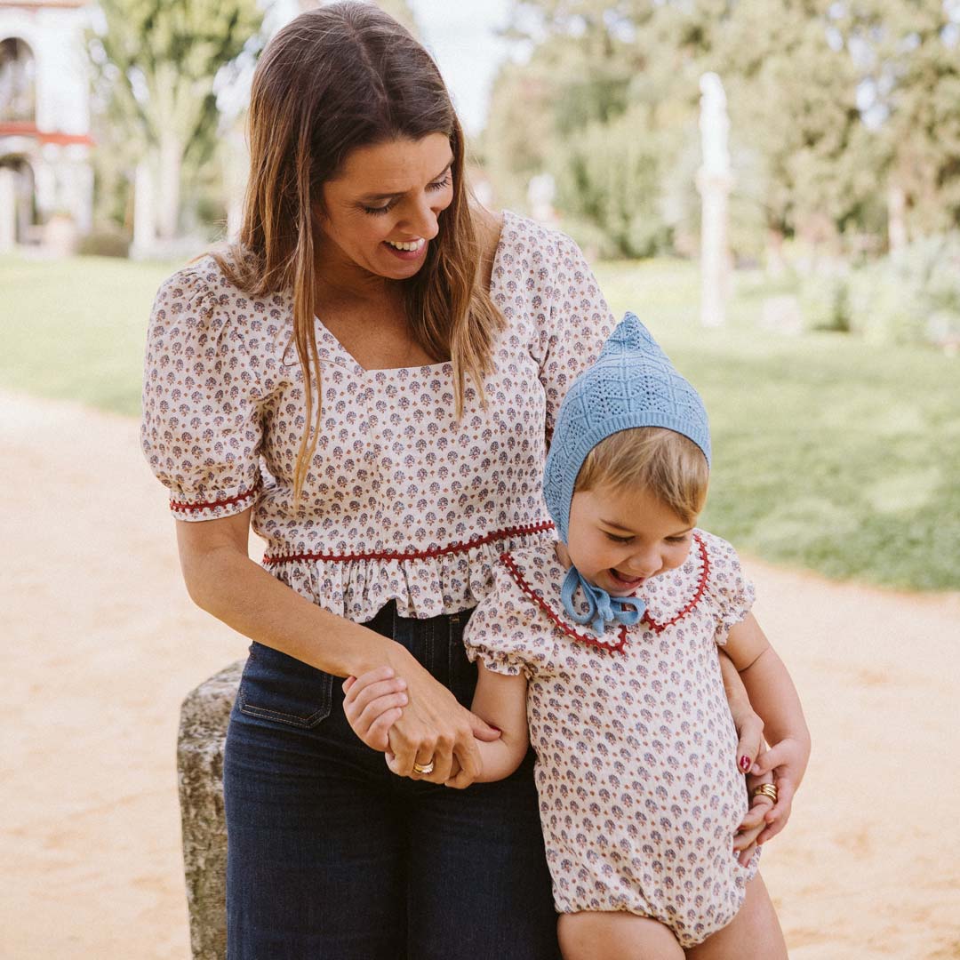 - Body UNISEX en el tejido Loto, una bambula cruda con estampado de flores indias en tonos añil y tangerine que llenará el armario de una dulzura especial.