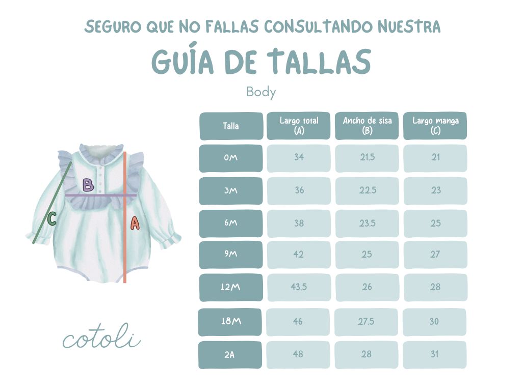 - IMPORTANTE: revisar guía de tallas. Si dudas entre dos tallas, coge la mayor.