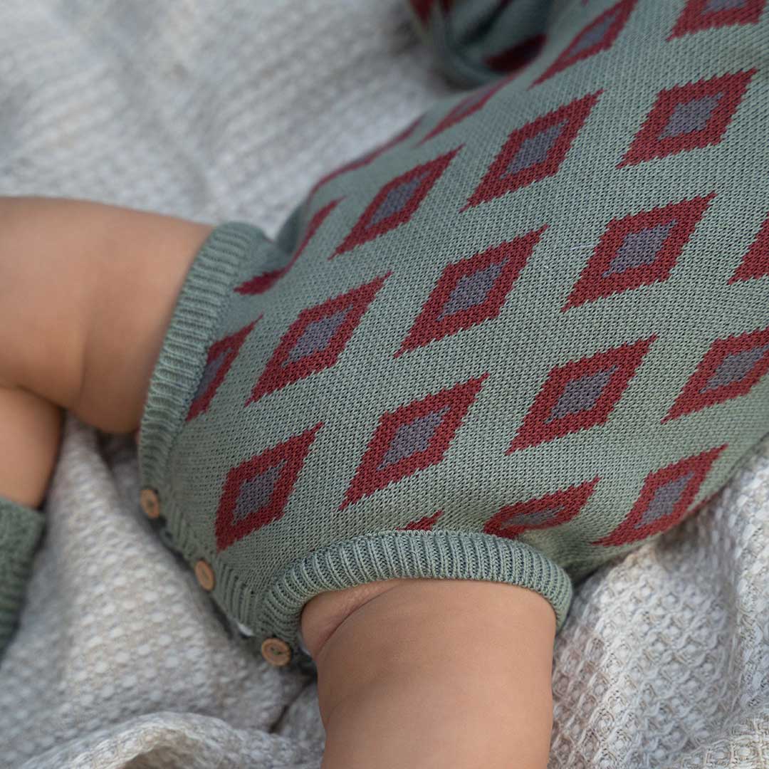 - Pelele en un punto de lo más ideal en color verde pino y detalles en guinda y gris.
