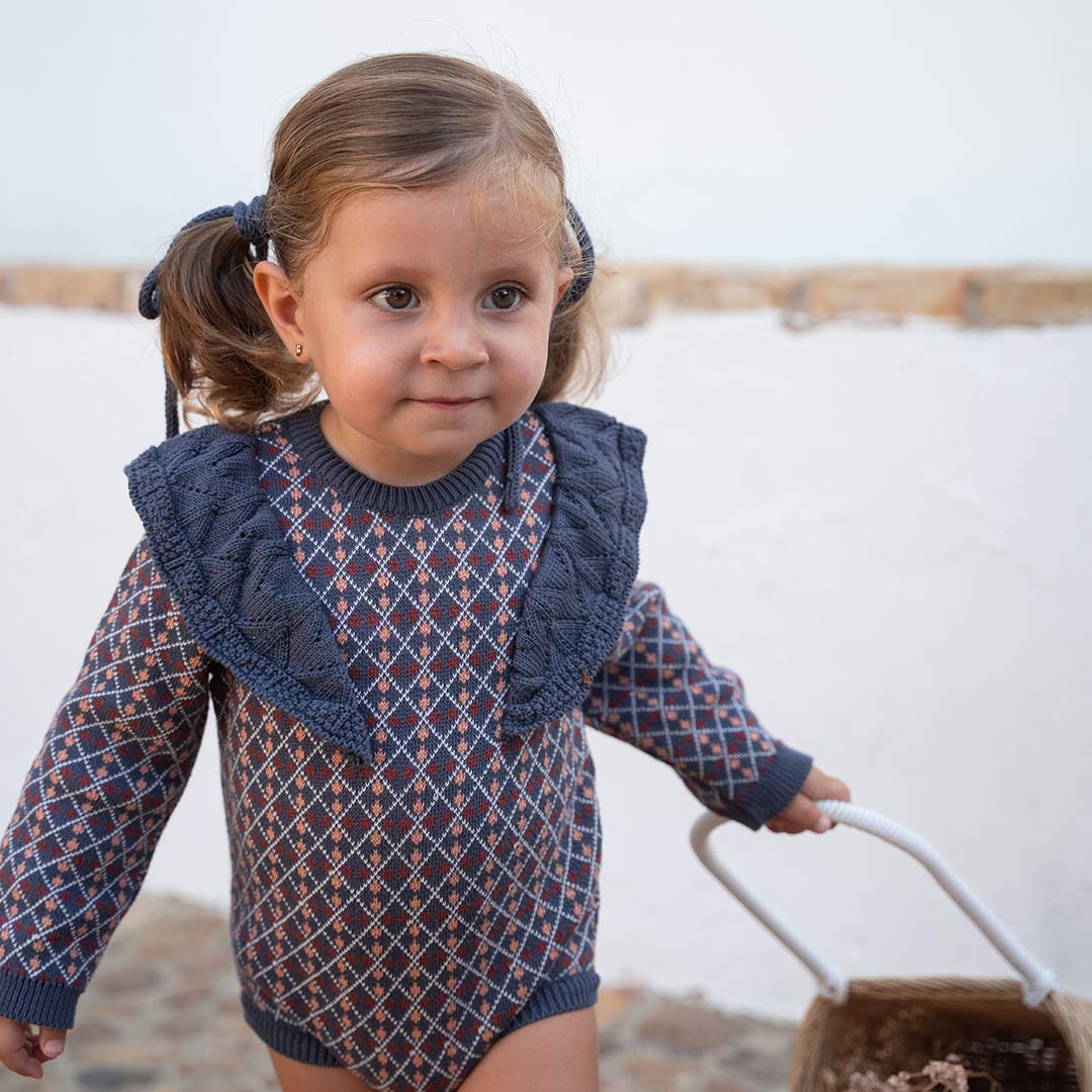 - Pelele de punto con volante sobre fondo tejano y detalles en salmón, granate y crudo de lo más ideal para este otoño/invierno.