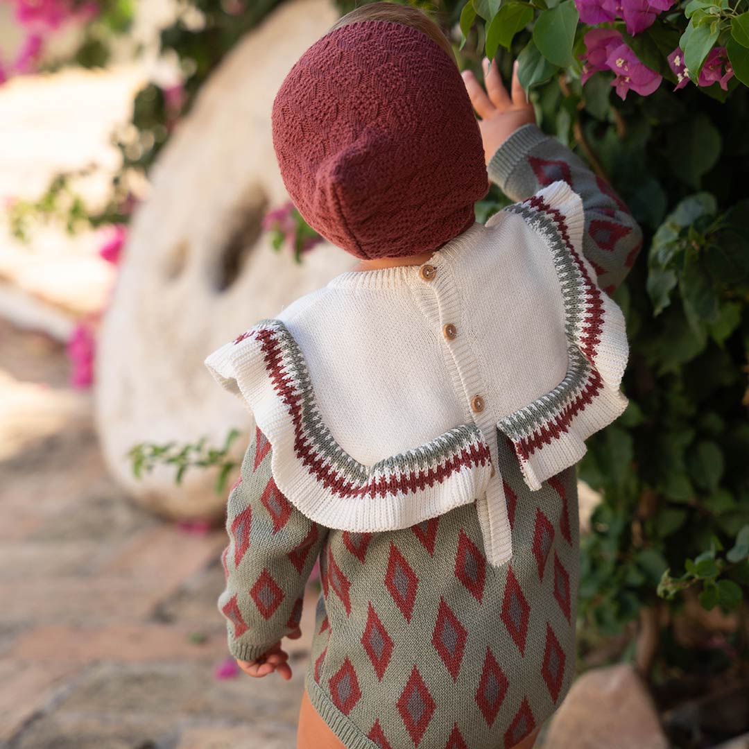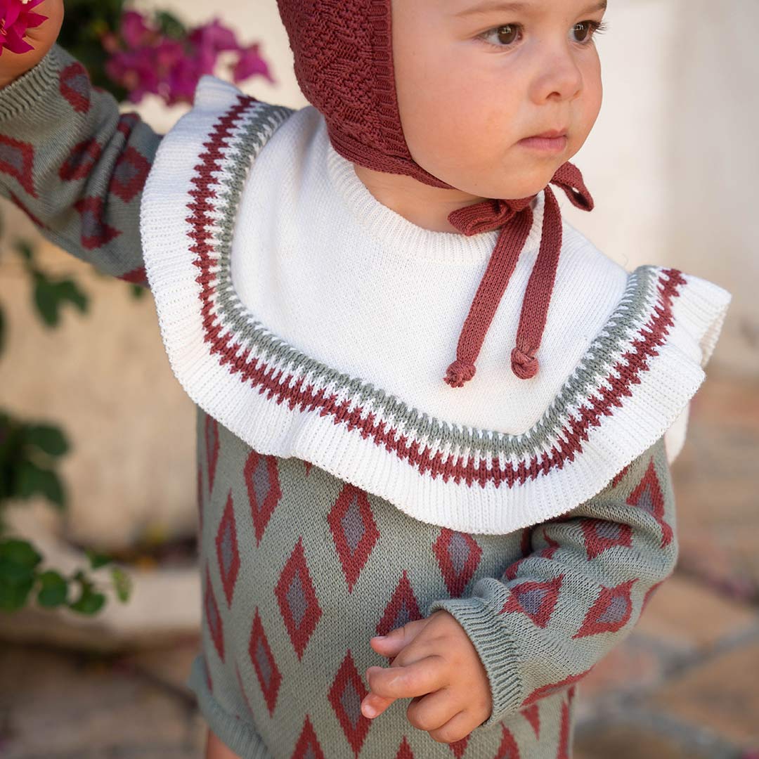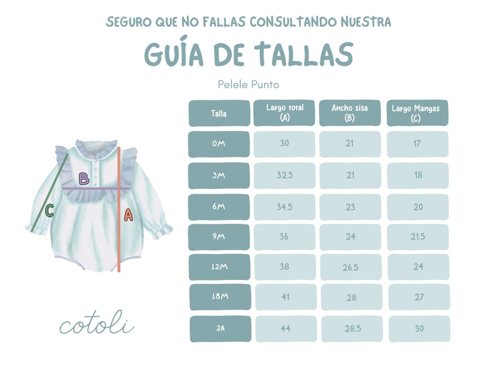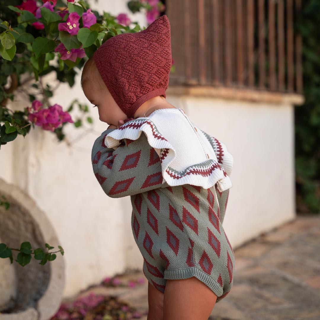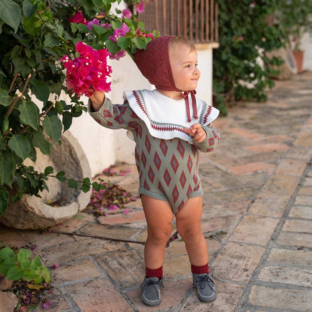 - Pelele con volante en un punto de lo más ideal en color verde pino y detalles en guinda y gris.