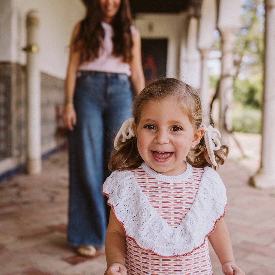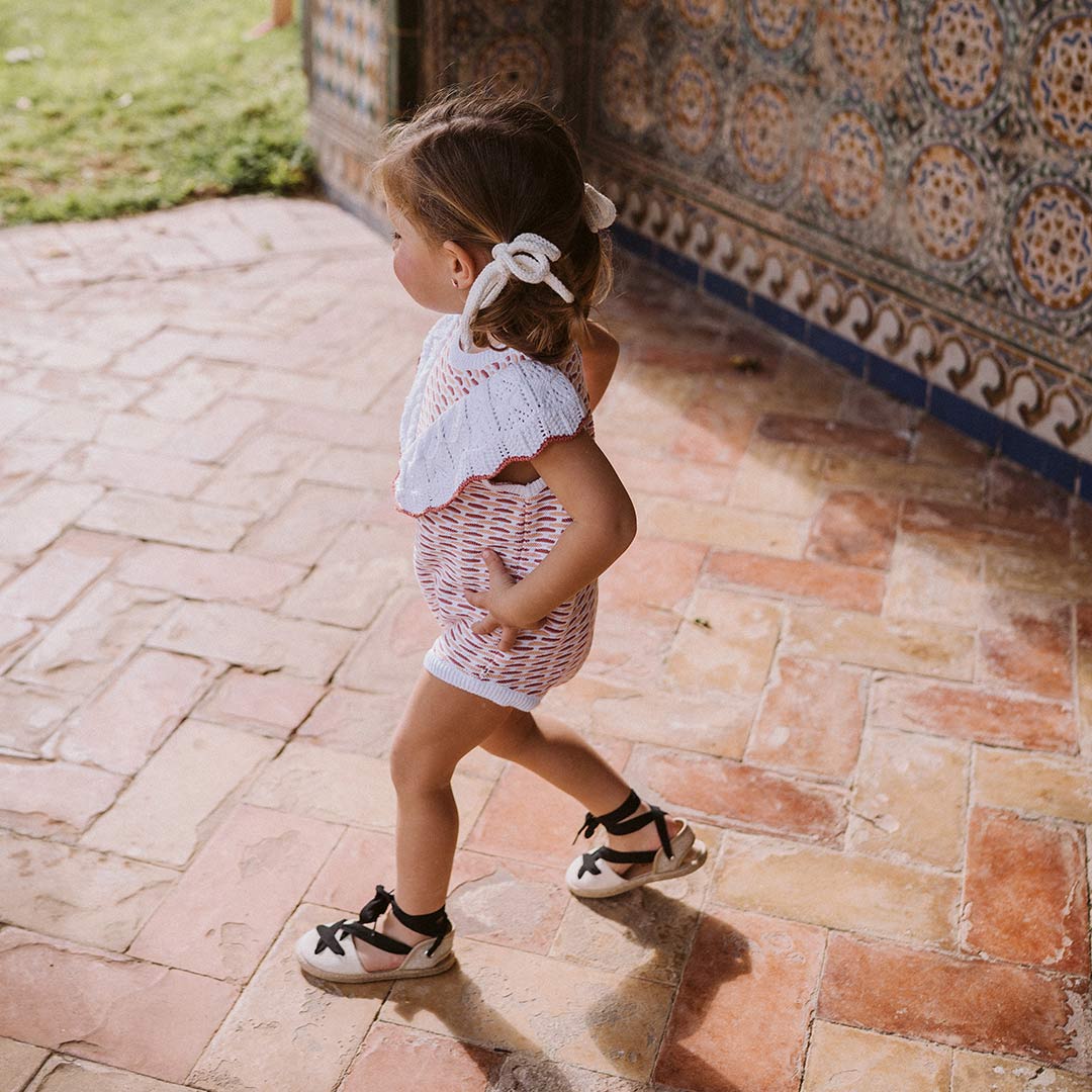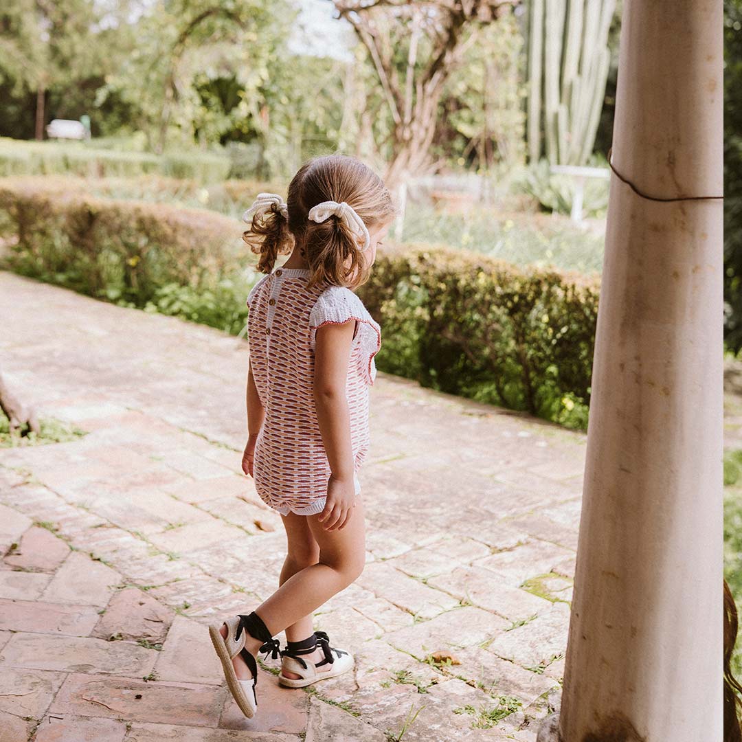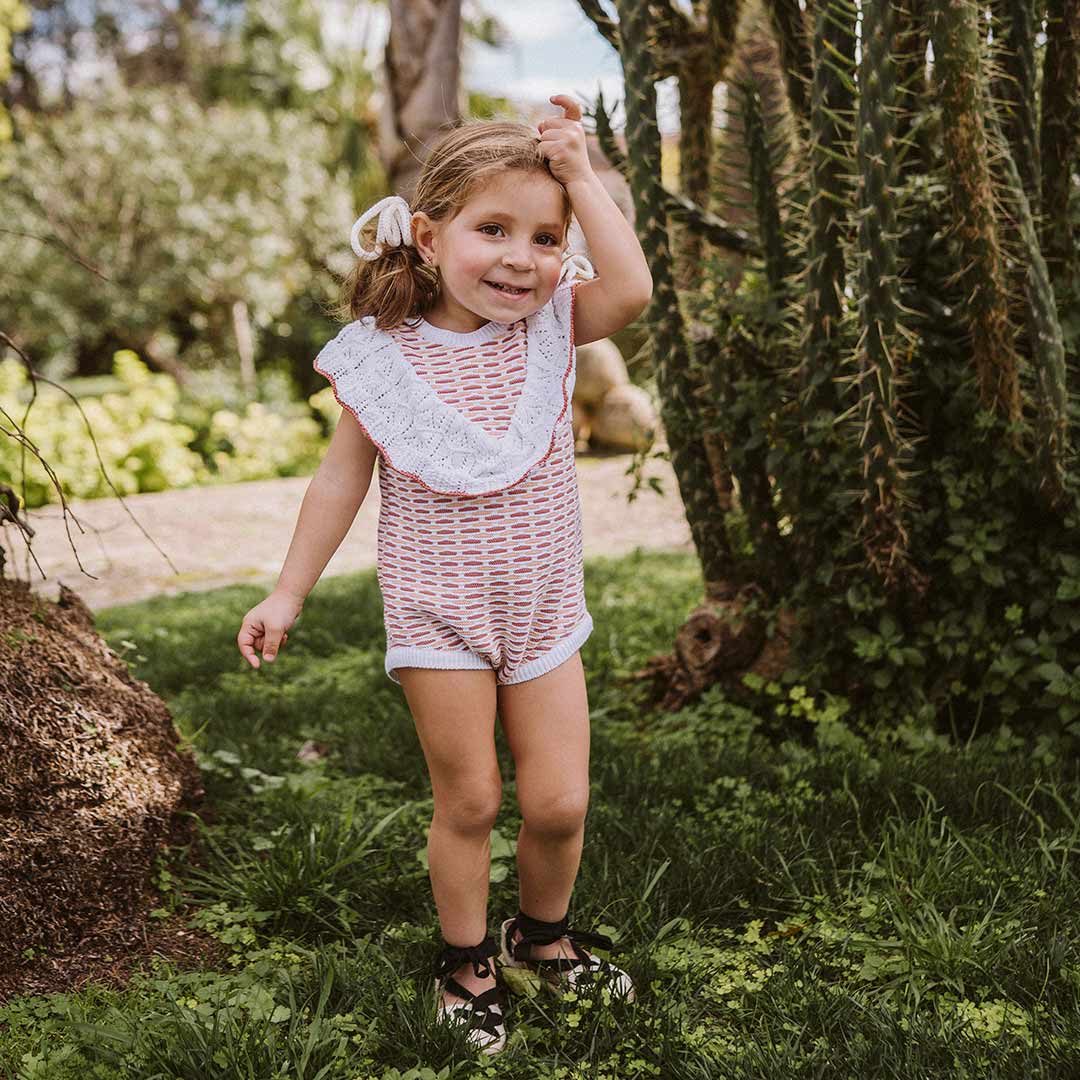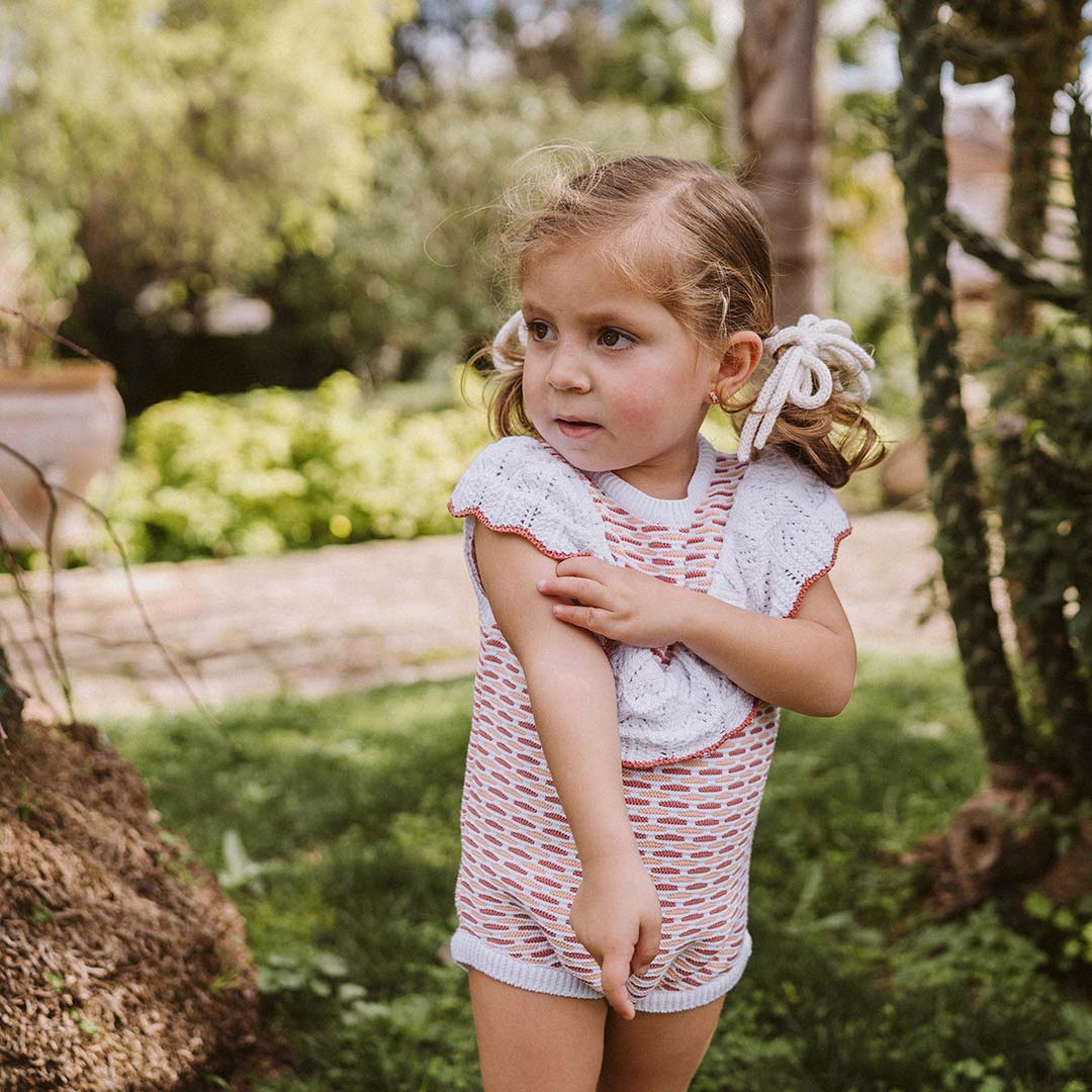 • Pelele volante de punto sobre fondo claro con detalles en tono marsala que le da el toque rompedor dentro de la simpleza que tiene este punto, y el tangerine que lo acompaña como una suave brisa de verano.