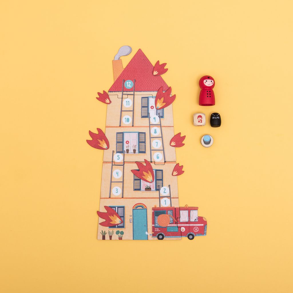¡Un juego de mesa cooperativo para niños a partir de los 4 años donde tendremos que ayudar a los bomberos a rescatar a un gatito del fuego! En formato bolsillo para llevar de viaje.