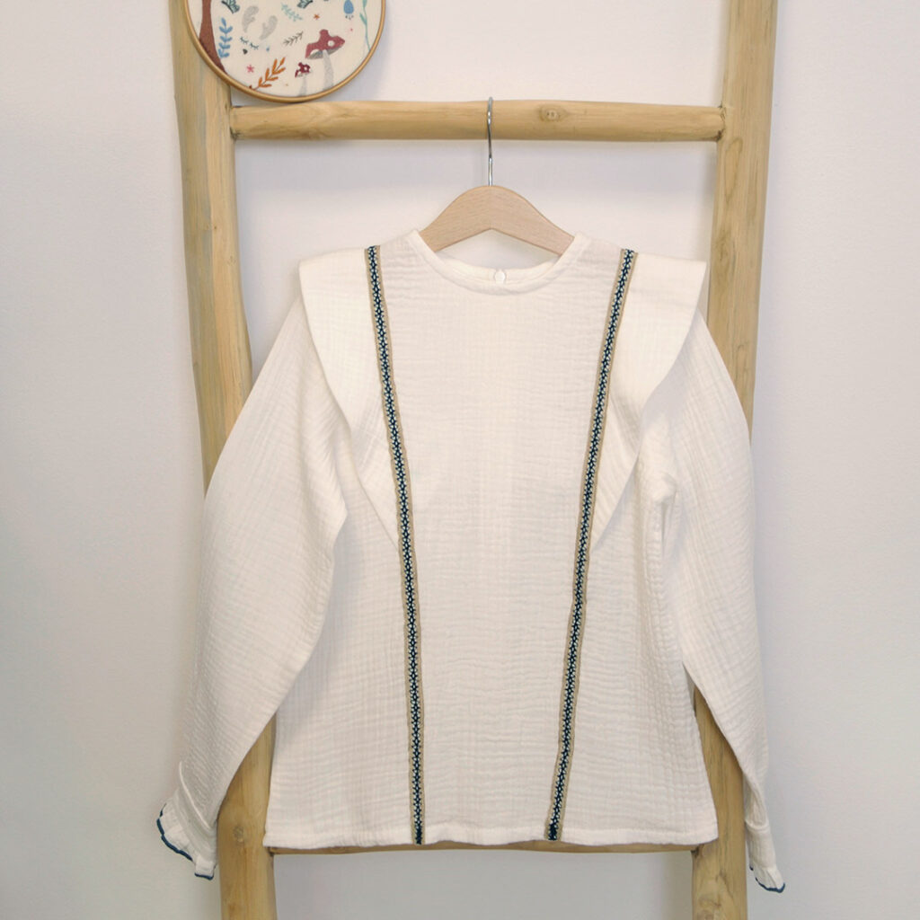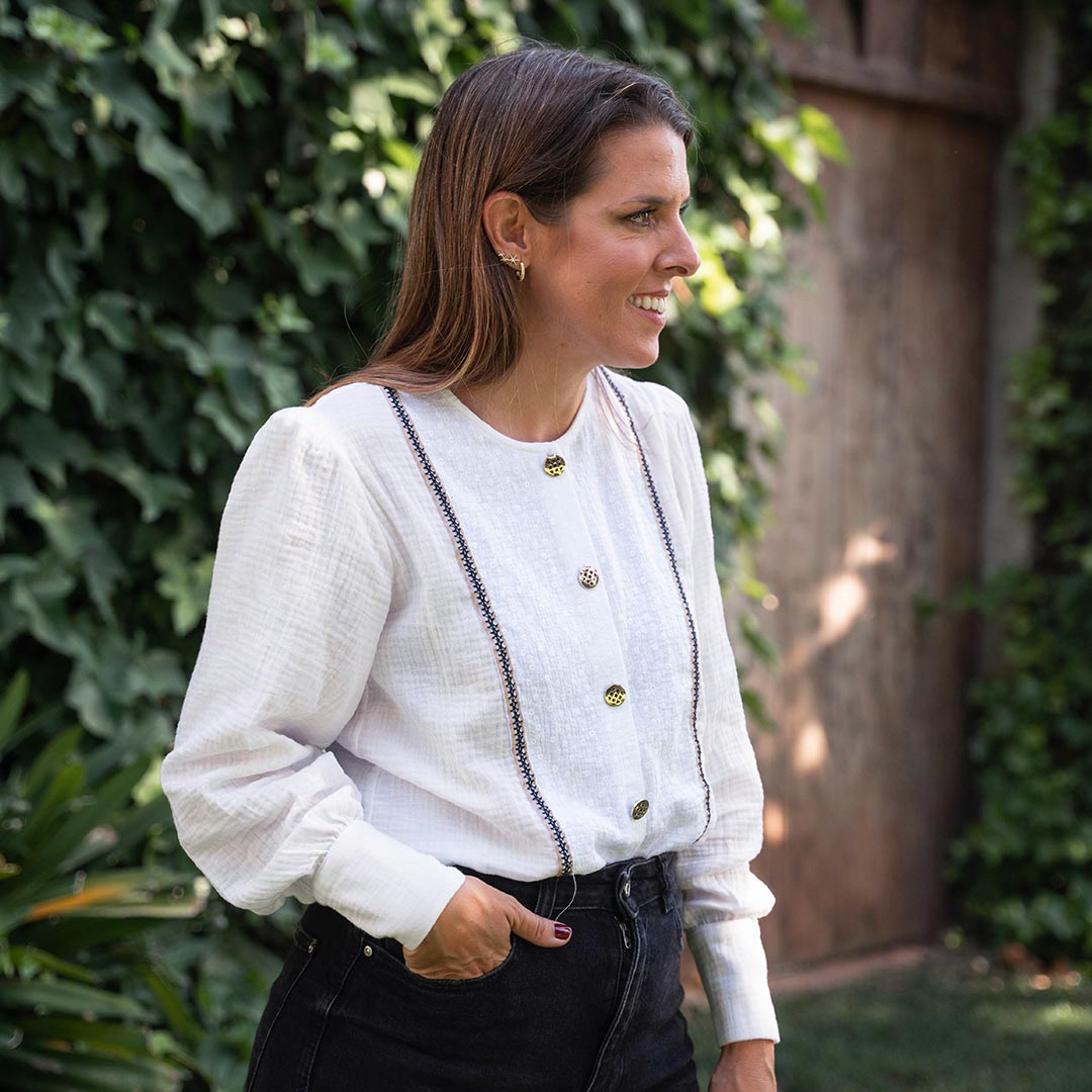 - Camisa de bambula en tono blanco roto combinado con tejido bordado. ¡Un fondo de armario que no puede faltar entre tus preferidas!