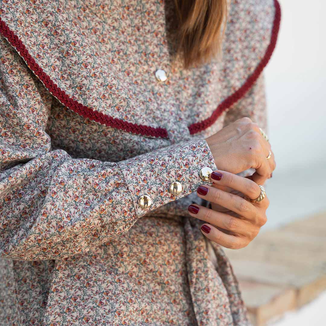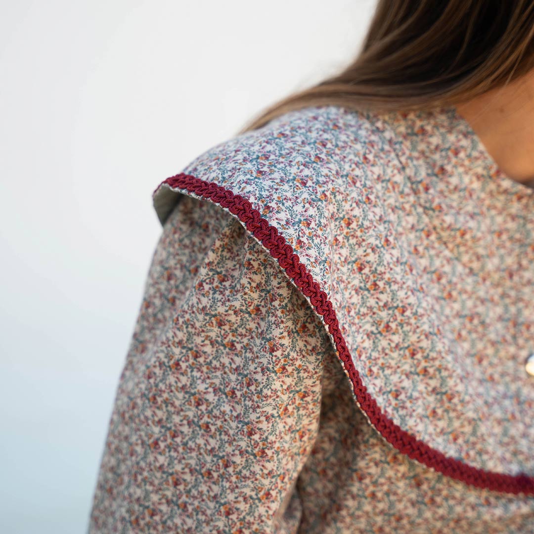 - Detalle de ondulina en tono guinda en forma de V alrededor de todo el volante.