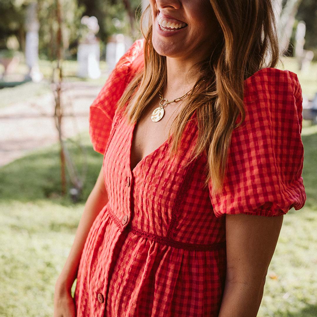 • Vestido largo de mujer en el estampado vichy de la colección Morfeo en tonos granate y coral.