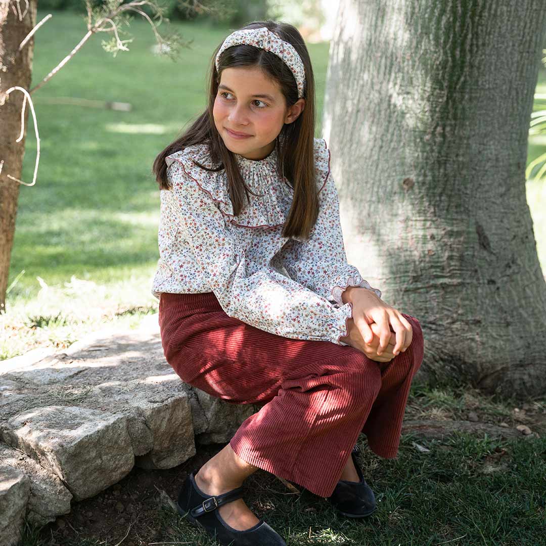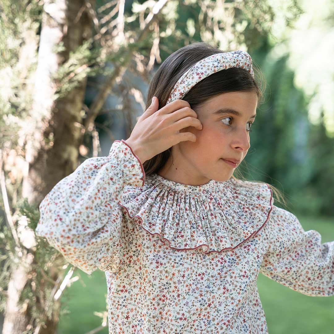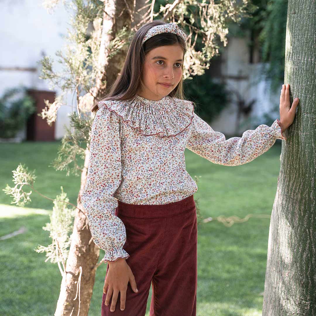 - Camisa niña del estampado de la colección Brilé con detalle de cuello bebé y nido de abeja.
