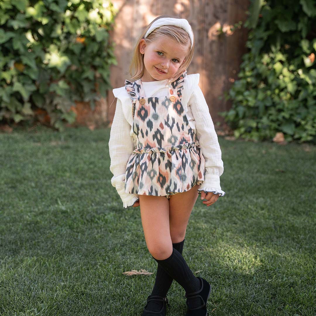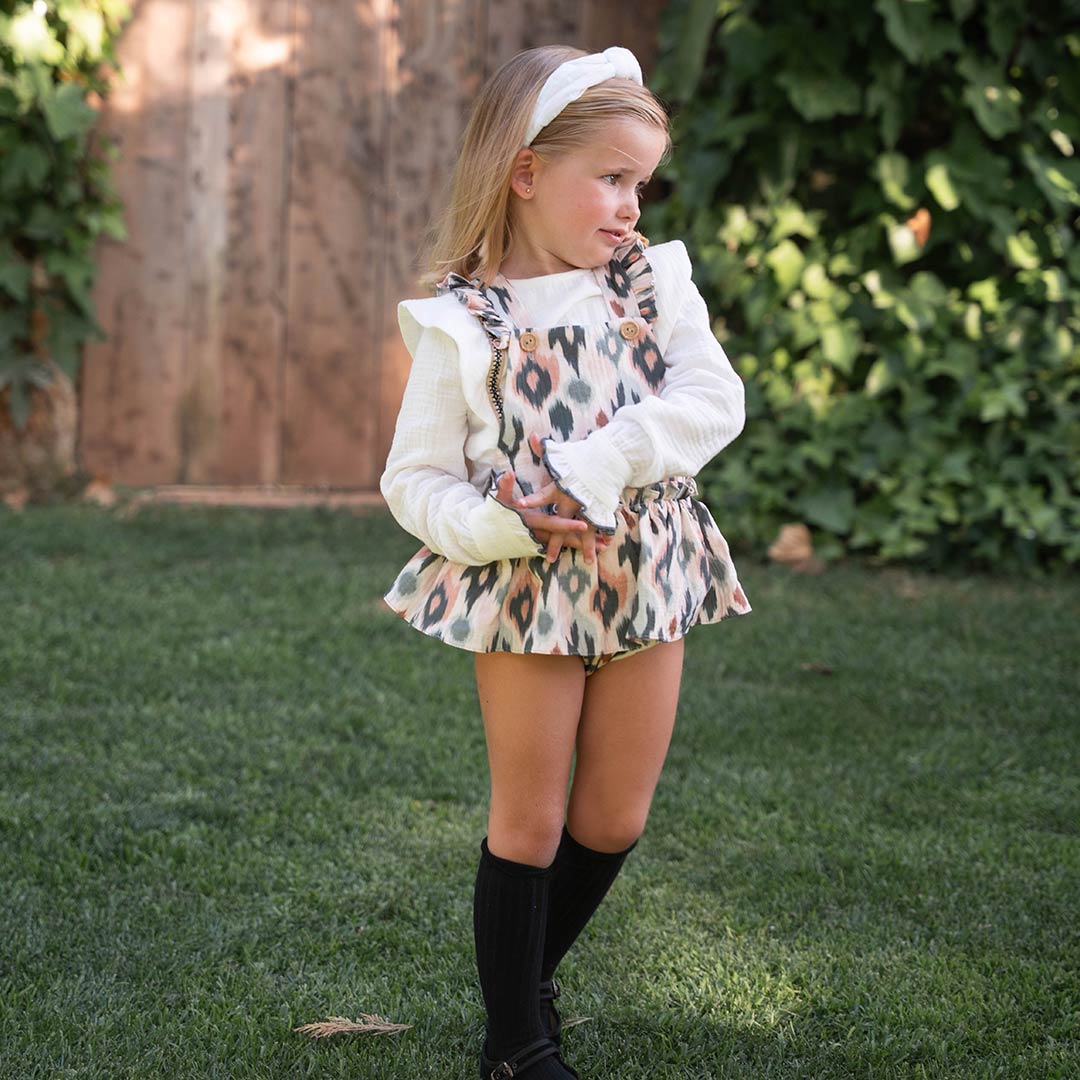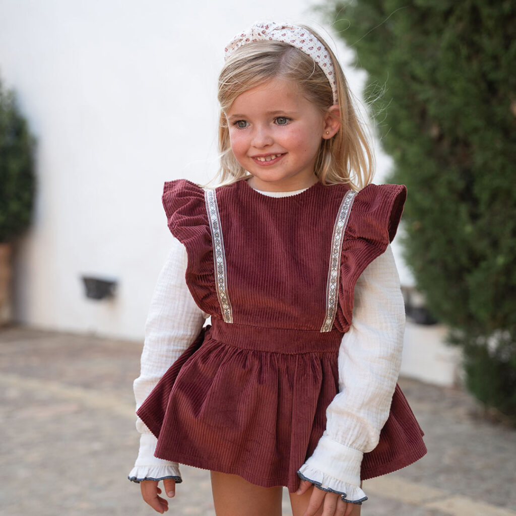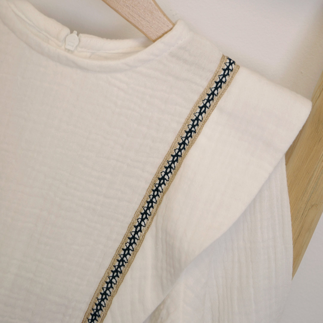 - Camisa de bambula en tono blanco roto combinado con tejido bordado. ¡Un fondo de armario que no puede faltar entre las prendas preferidas de tu peque!