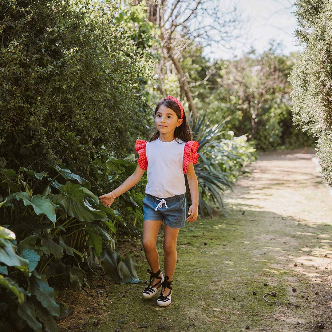 - Camiseta con doble volante en el estampado vichy de la colección Morfeo. ¡Una combinación de cuadros granate y coral que no pasará desapercibida!