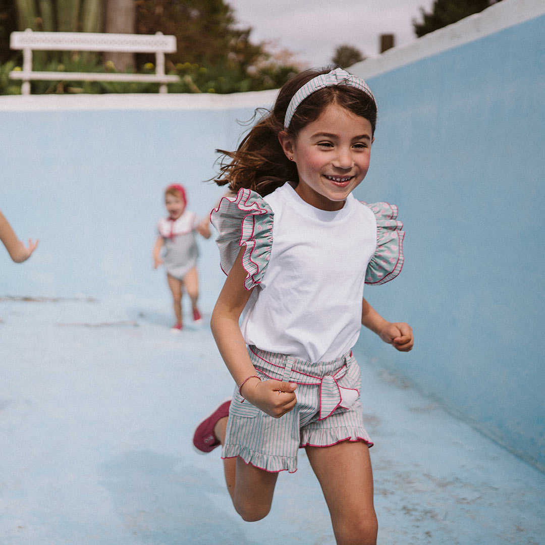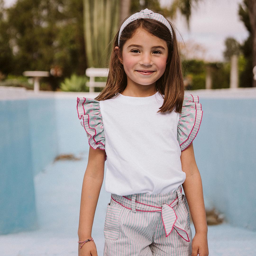 - Camiseta de niña con doble volante combinando los estampados Mimpi y Riyo.