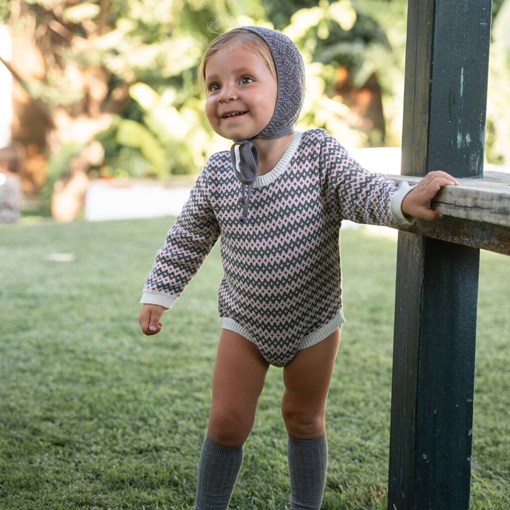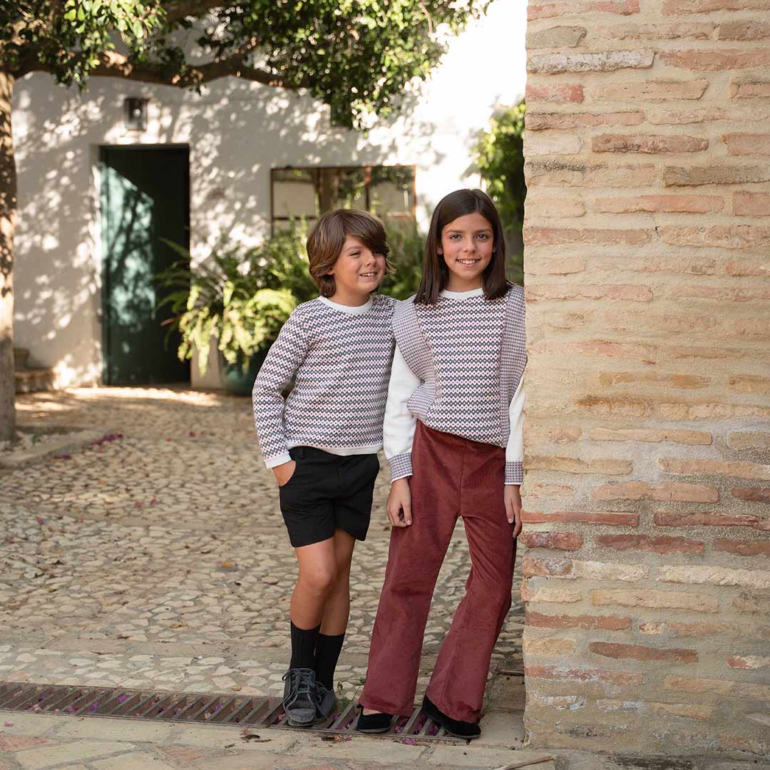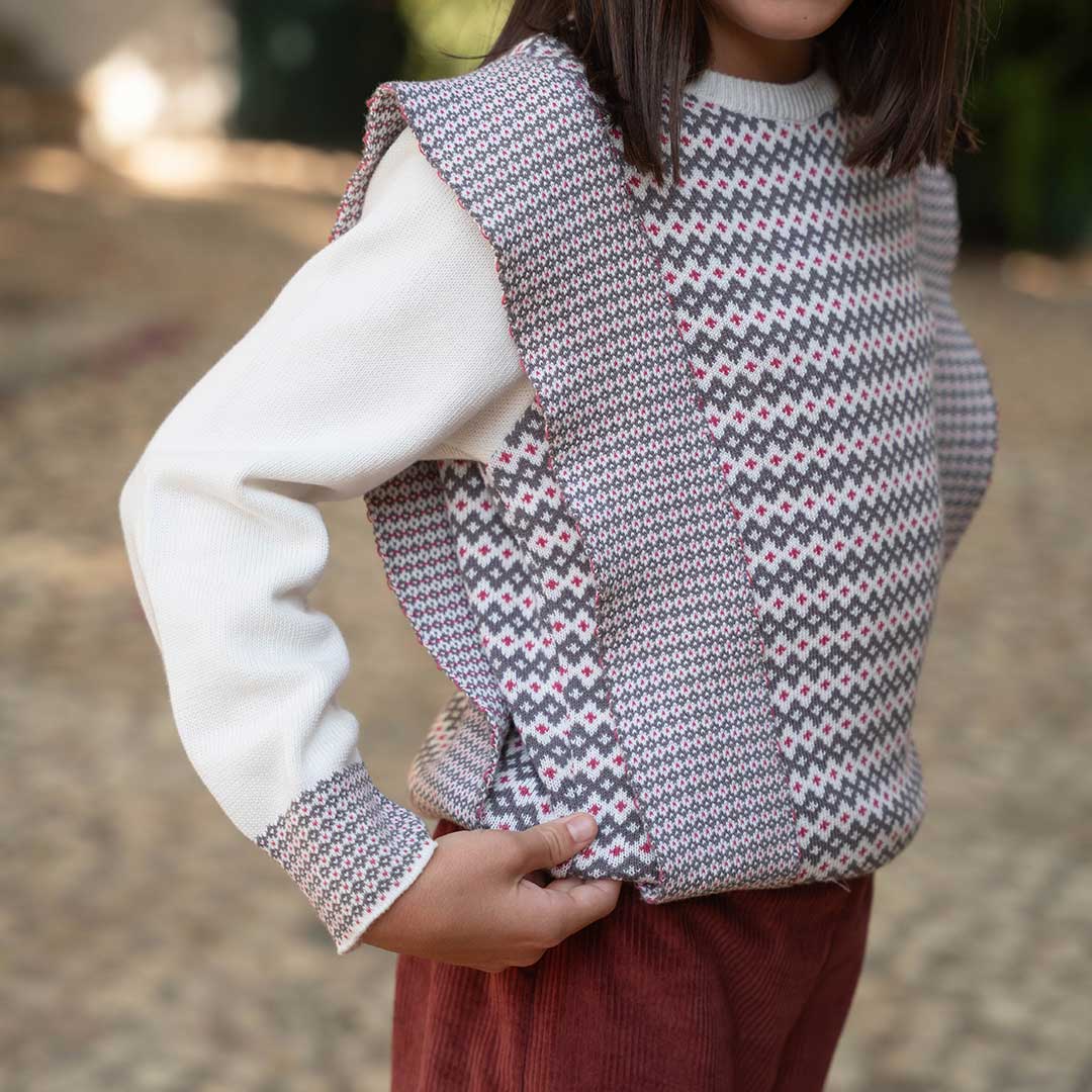 - Jersey con volante de punto con dibujo de rombitos gris y detalles en guinda de lo más ideal para este otoño/invierno.