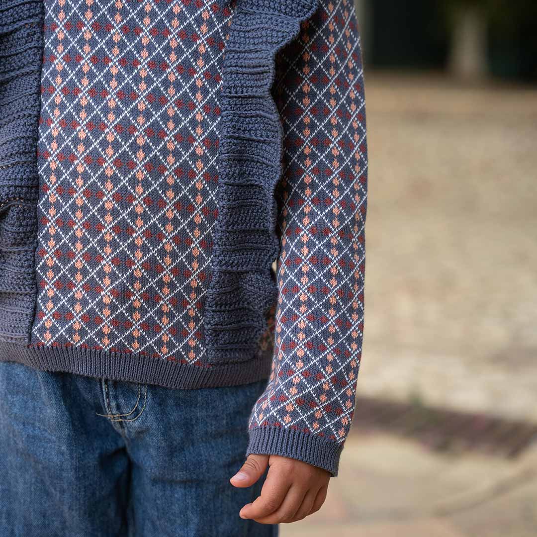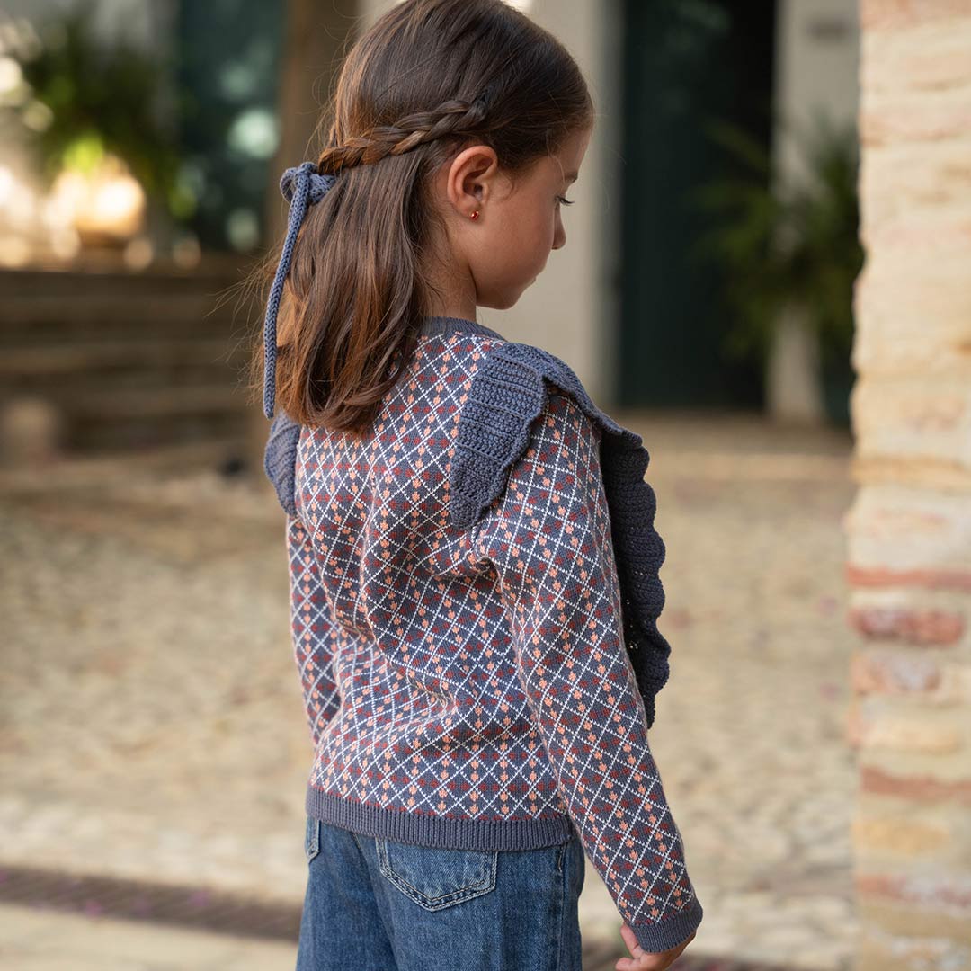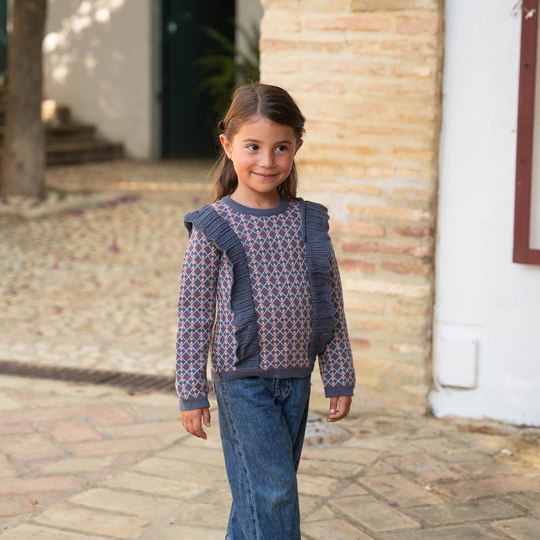 - Jersey con volante en un punto con fondo tejano y detalles en salmón, granate y crudo de lo más ideal para este otoño/invierno.