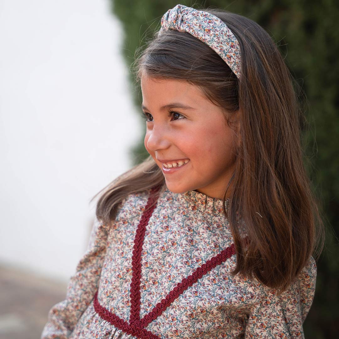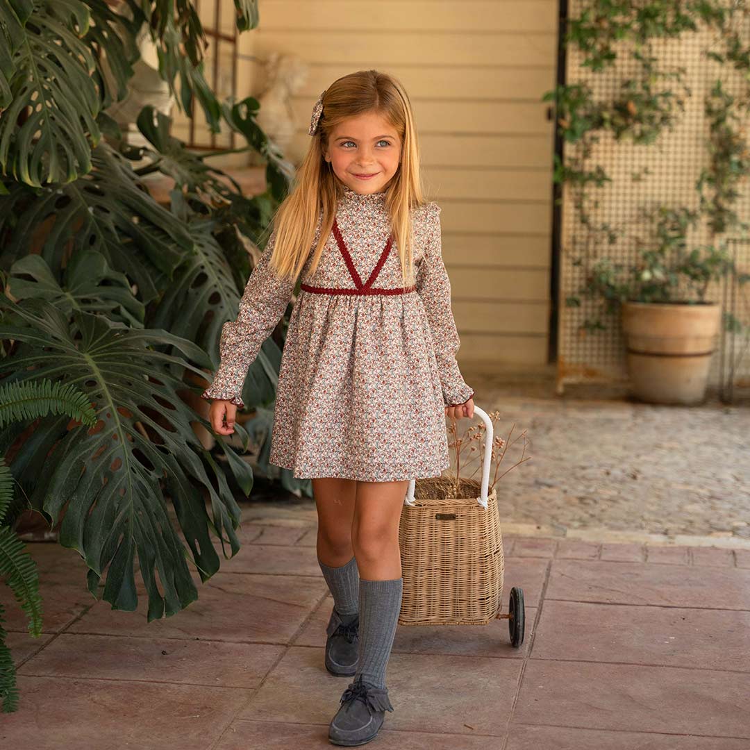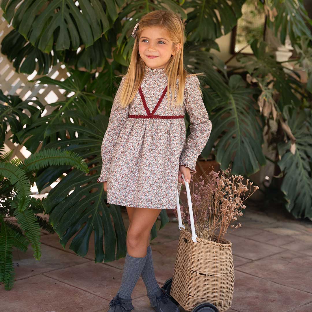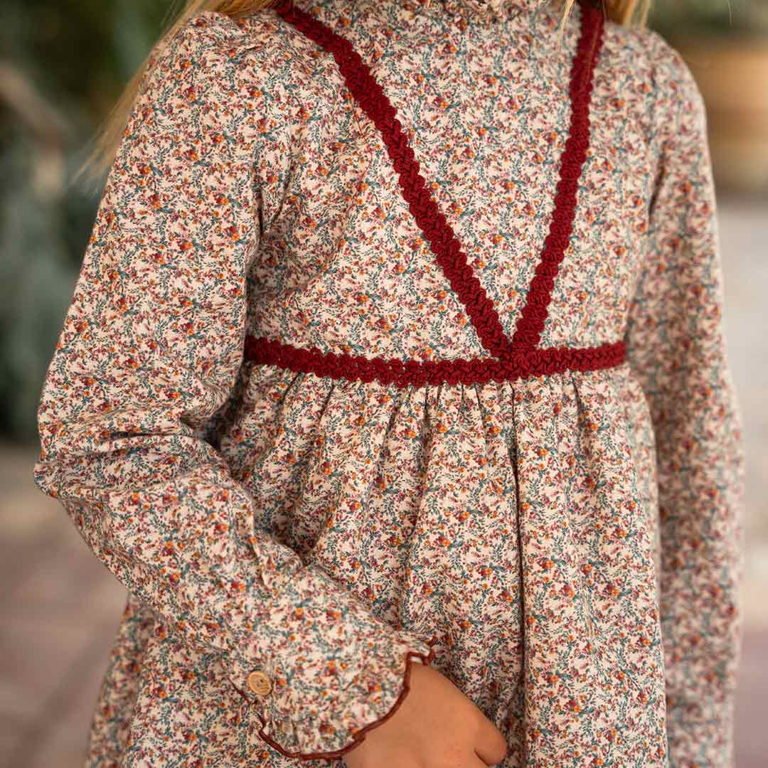 - Vestido en estampado Chacana con detalle de ondulina en tono guinda en forma de V alrededor de todo el volante.