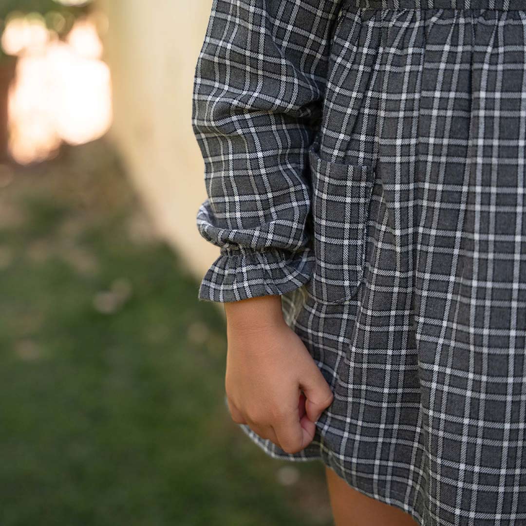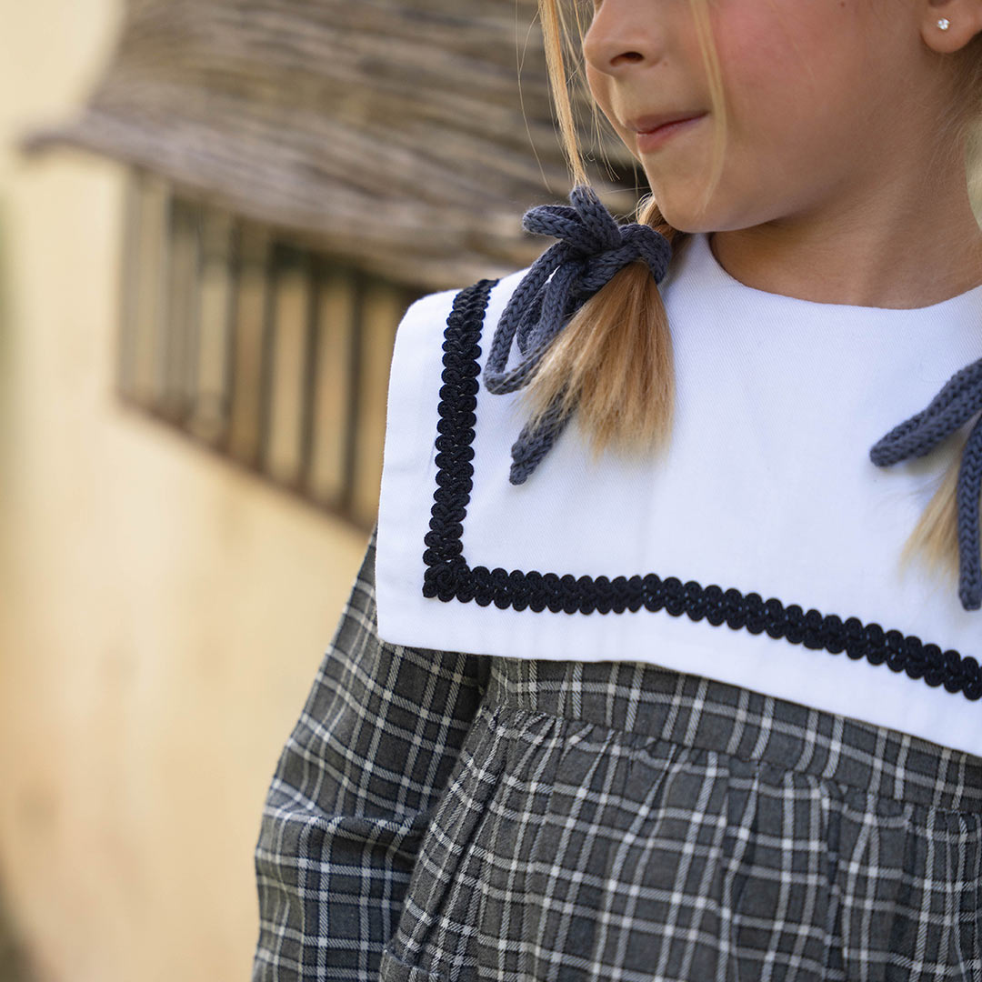 - Vestido en estampado Peuco con detalle de cuello bebé con tira de terciopelo que le da un toque de lo más ideal.