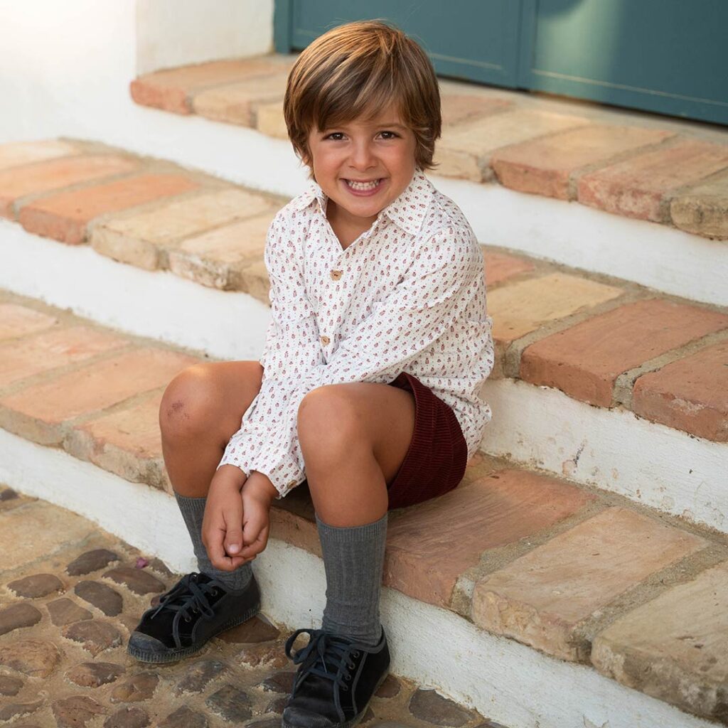 - Pantalón corto en pana granate con elástico en cinturilla.